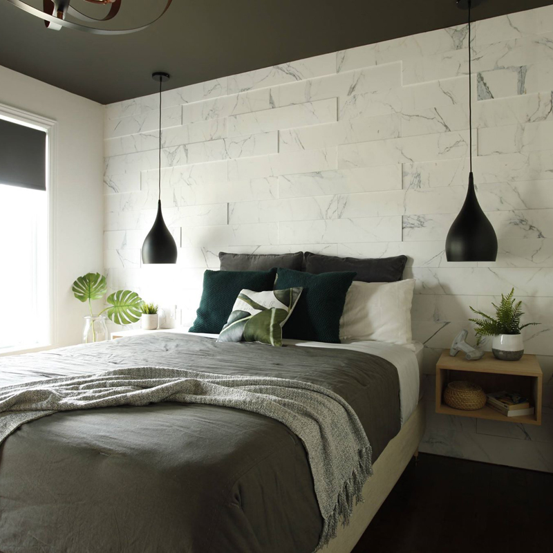 Des planchettes rectangulaires marbrées d'épaisseurs différentes, quelle jolie façon de créer un point focal à la tête de notre lit! Sur la photo, notre revêtement DUO Atrium! Pour en savoir plus sur celui-ci, c'est par ici!